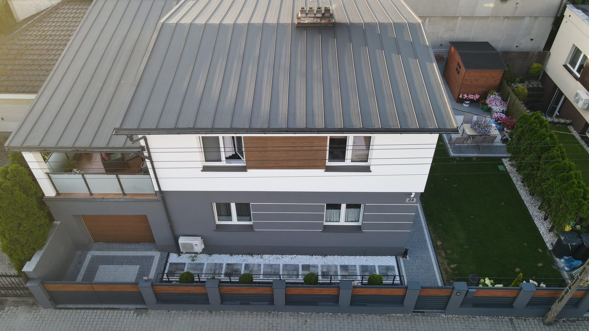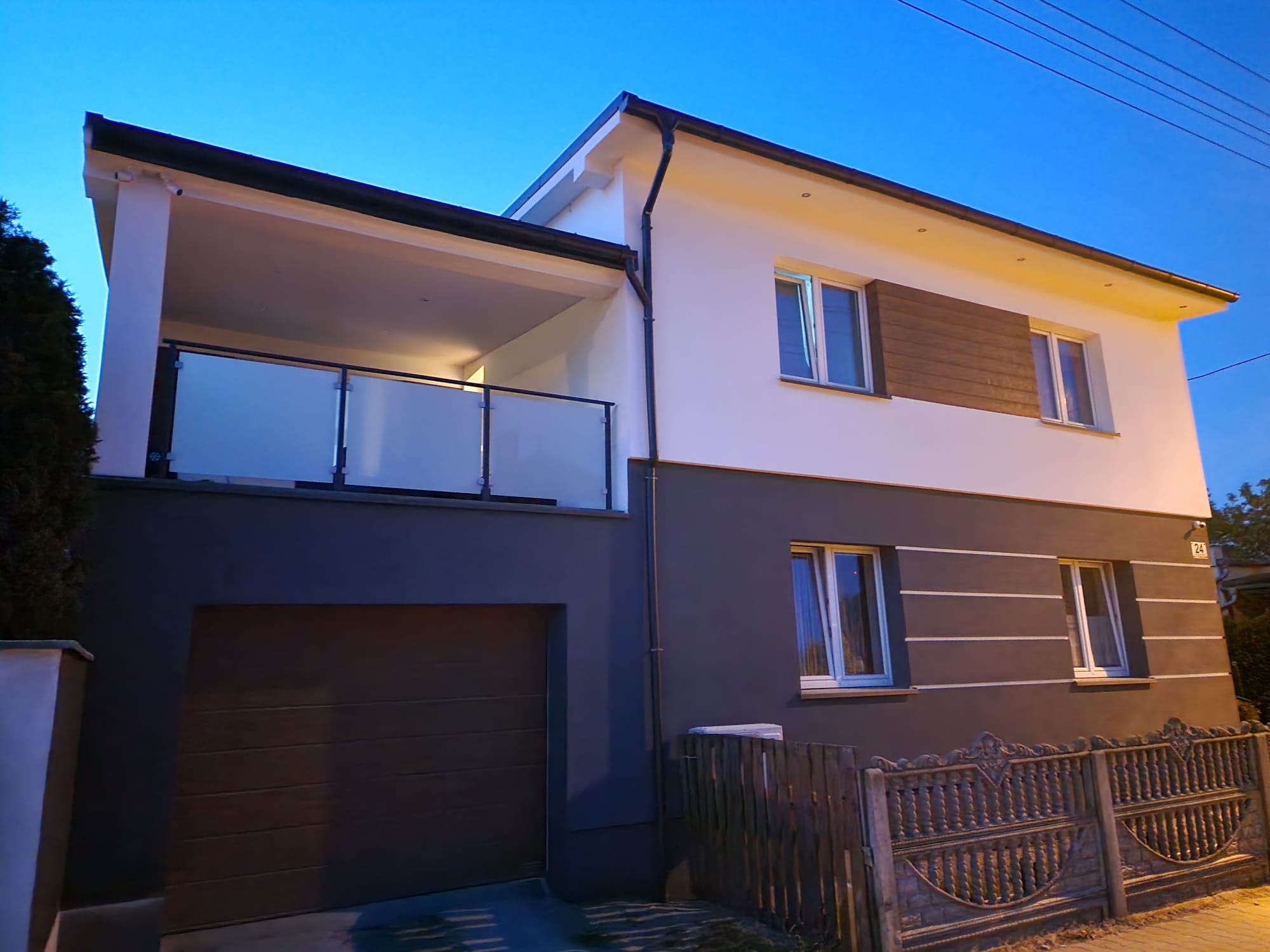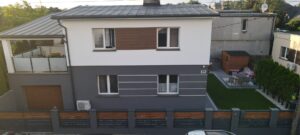 Metamorfoza elewacji nadała budynkowi nowoczesny i elegancki wygląd. Połączenie jasnej elewacji z grafitowym dołem oraz drewnopodobnymi akcentami sprawiło, że dom zyskał wyrazisty, spójny i bardziej prestiżowy charakter. Całość prezentuje się świeżo, estetycznie i zdecydowanie bardziej reprezentacyjnie.