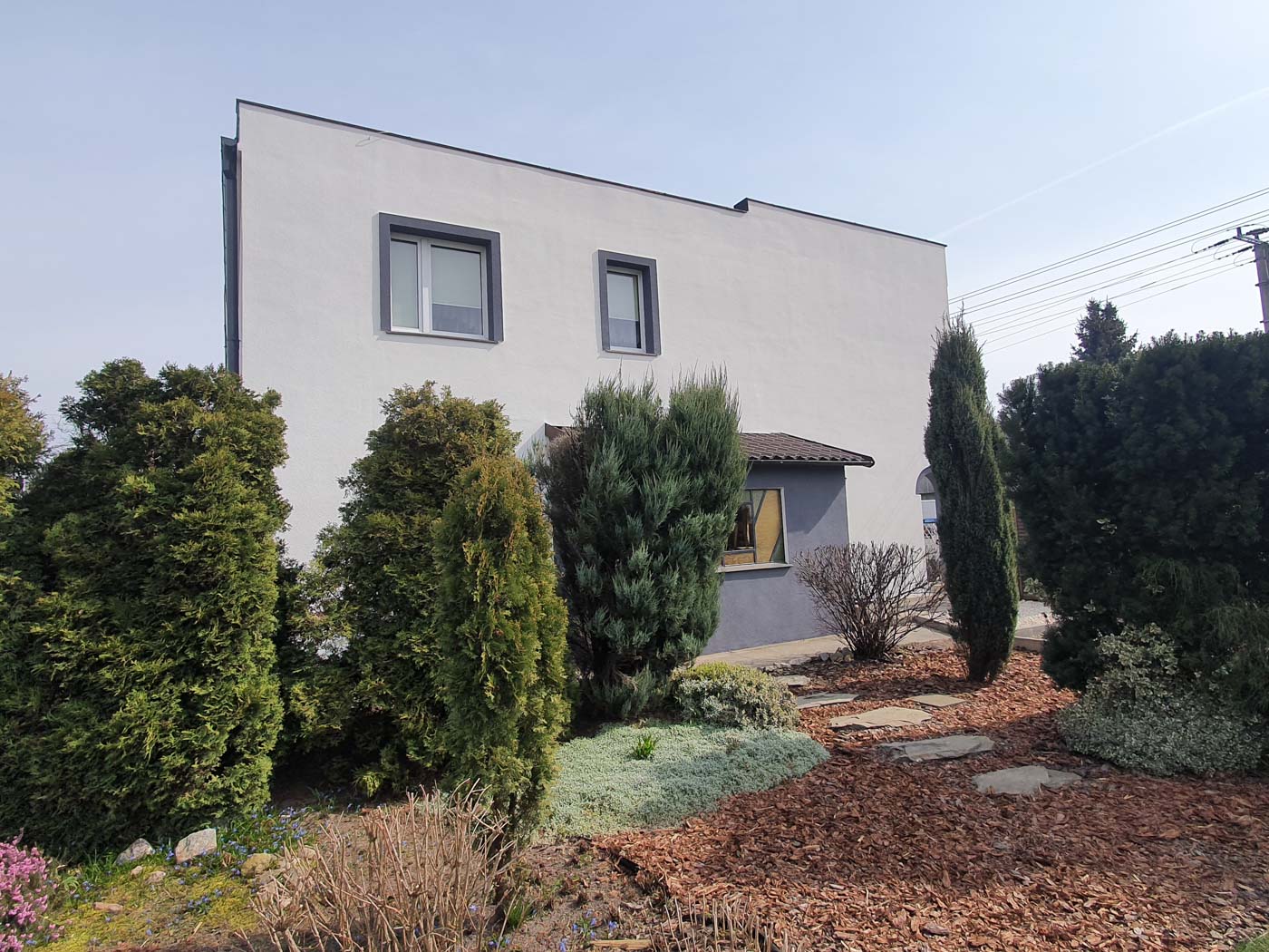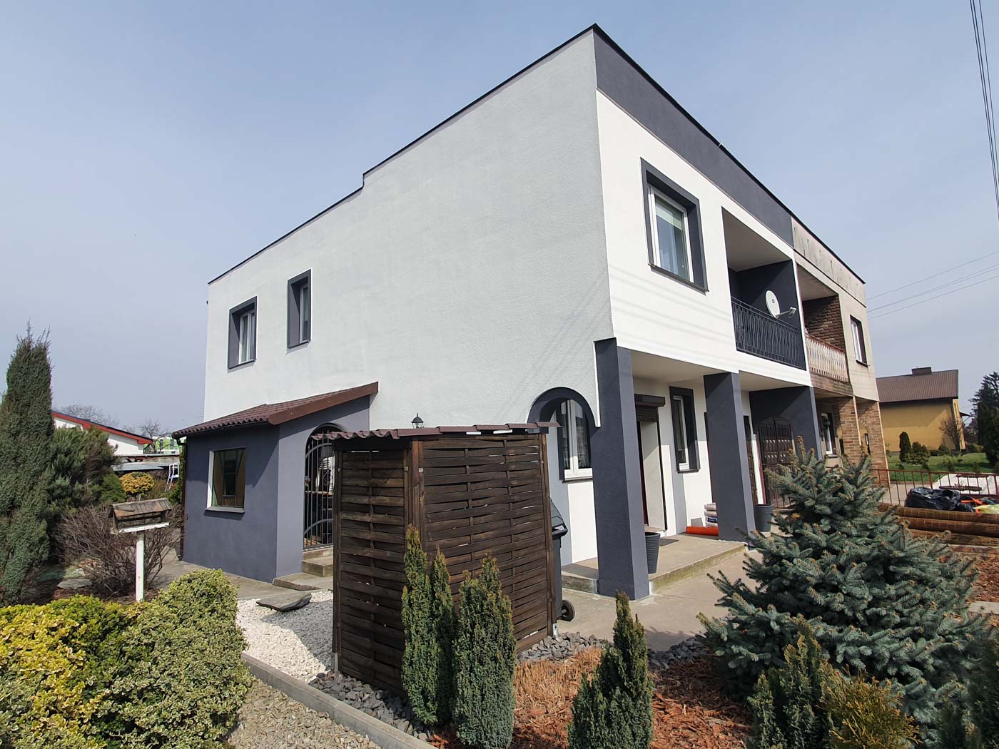 Elewacja budynku utrzymana jest w nowoczesnej, minimalistycznej stylistyce, opartej na jasnych, jednolitych powierzchniach tynku w odcieniu bieli przełamanej grafitowymi obramowaniami okien i krawędziami dachu, co nadaje bryle wyrazisty, geometryczny charakter, a prosta, dwukondygnacyjna forma z płaskim zadaszeniem, wyraźnie zaznaczonymi narożnikami oraz balkonem na piętrze tworzy spójną i elegancką całość, która w połączeniu z uporządkowaną zielenią wokół budynku podkreśla jego nowoczesny i zadbany wygląd.