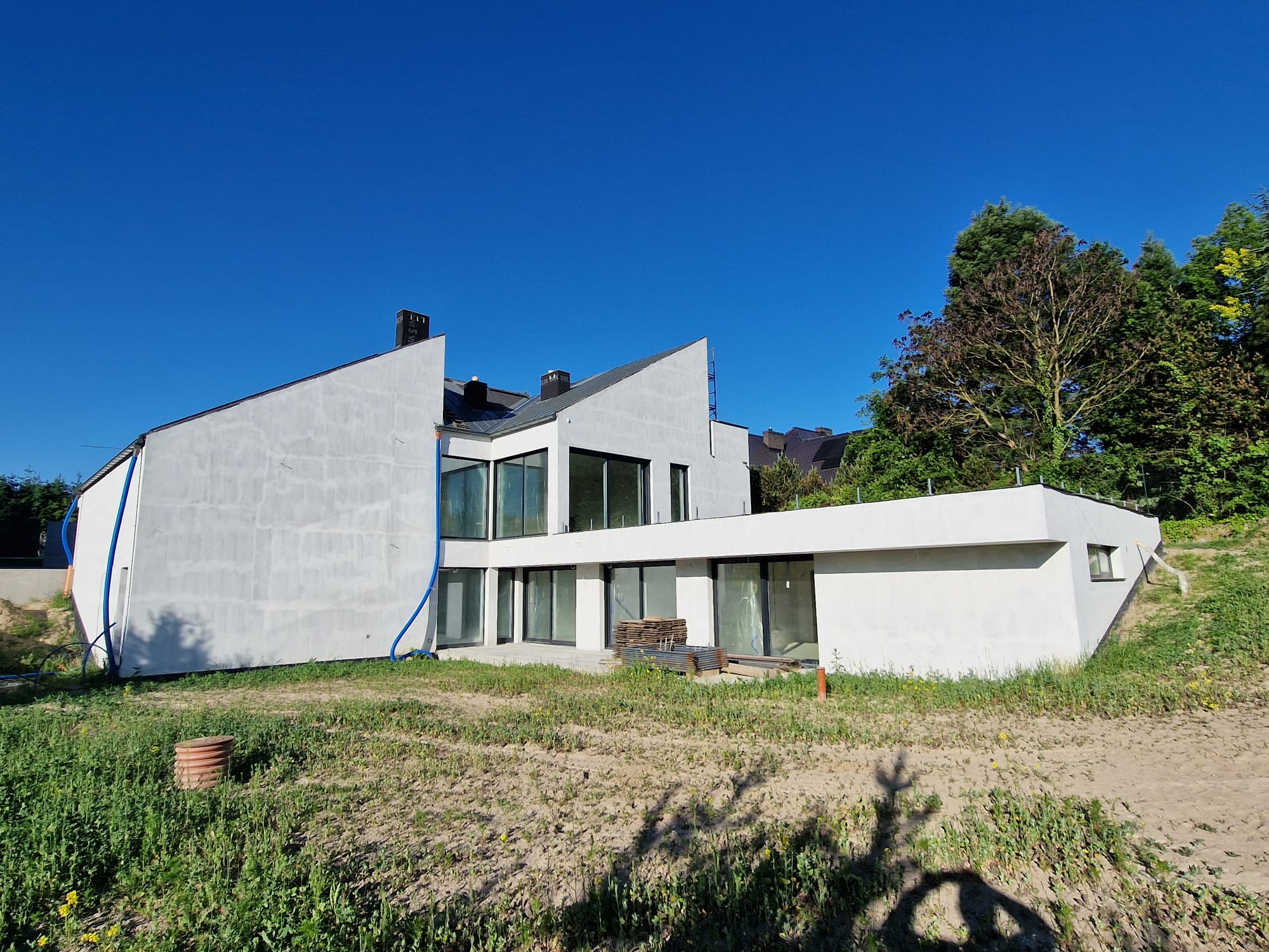 Nowoczesna, minimalistyczna elewacja z dynamicznymi, skośnymi dachami, jasnym wykończeniem i dużymi przeszkleniami.