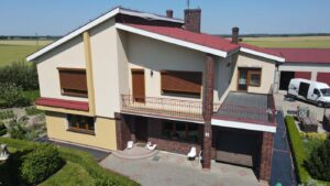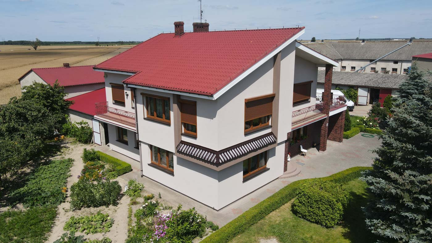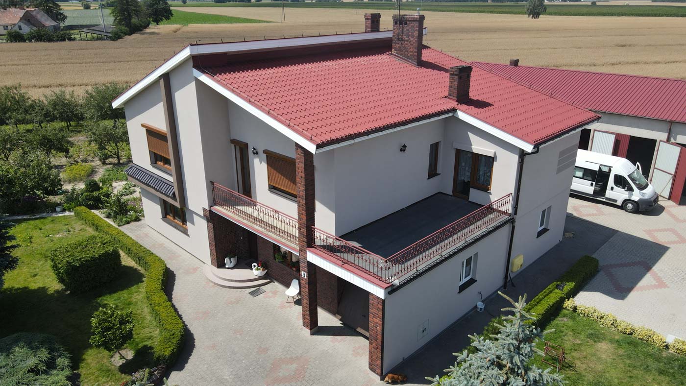 Elewacja budynku łączy klasyczną formę domu jednorodzinnego z eleganckim, ponadczasowym wykończeniem, opartym na jasnych tynkach w odcieniach kremu i beżu zestawionych z ceglanymi akcentami przy wejściu i na filarach, co nadaje bryle wyrazistości i solidnego charakteru, a spadzisty dach pokryty czerwoną dachówką, drewnopodobna stolarka oraz przestronne balkony z metalowymi balustradami podkreślają reprezentacyjny wygląd budynku i harmonijnie wpisują go w zadbane, zielone otoczenie posesji.