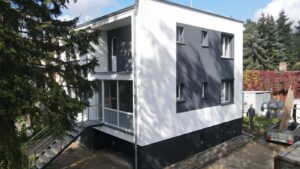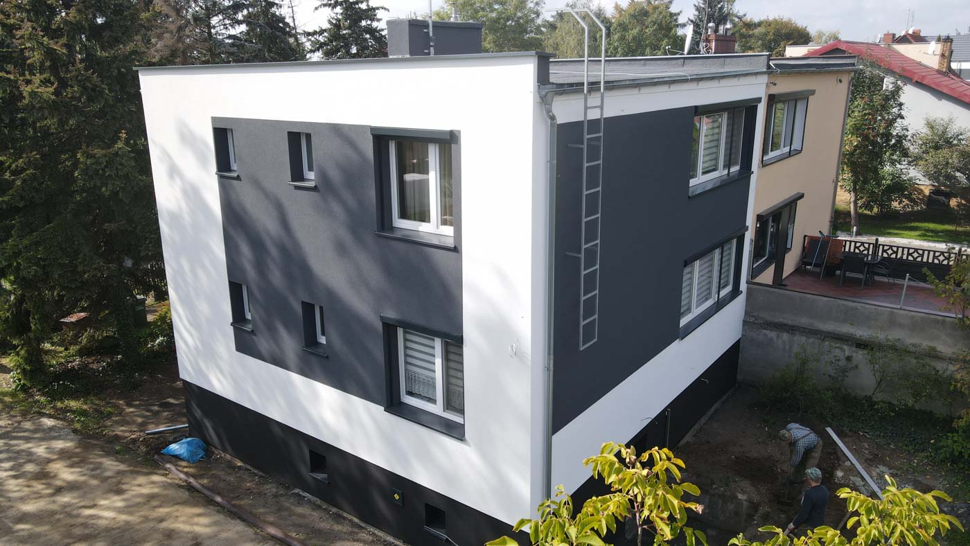 Nowoczesna elewacja po kompleksowej termomodernizacji. Kontrastowe kolory, precyzyjne detale i trwałe materiały nadają budynkowi świeży wygląd, poprawiają efektywność energetyczną oraz zwiększają komfort i wartość nieruchomości.