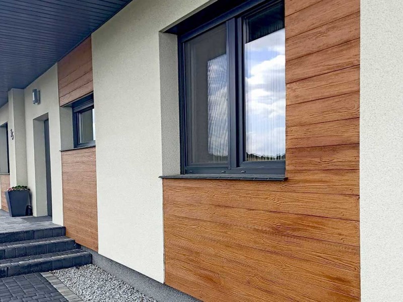 • Imitacja deski drewnianej na elewacji – naturalny efekt drewna bez konieczności konserwacji, nowoczesny wygląd budynku.